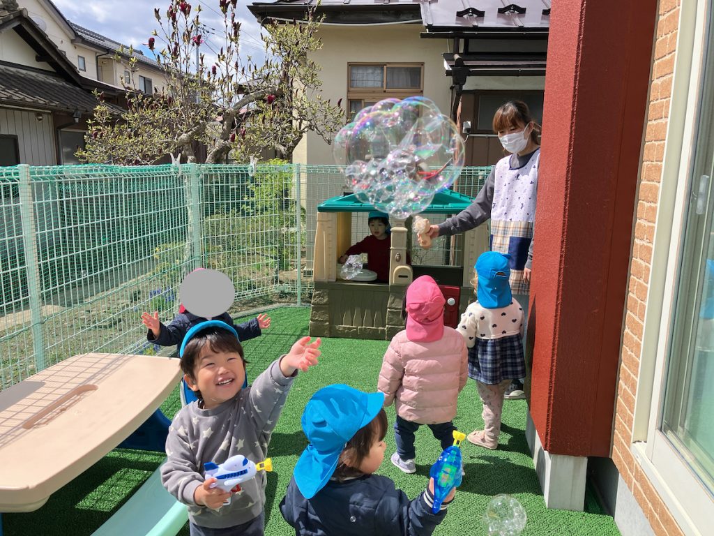久しぶりにシャボン玉遊びをしました。風に吹かれるしゃぼん玉を「待て待て〜」と追いかけて楽しんでいたくま組さん。ストローで吹くことを先生に教えて貰い、上手に出来ていました。