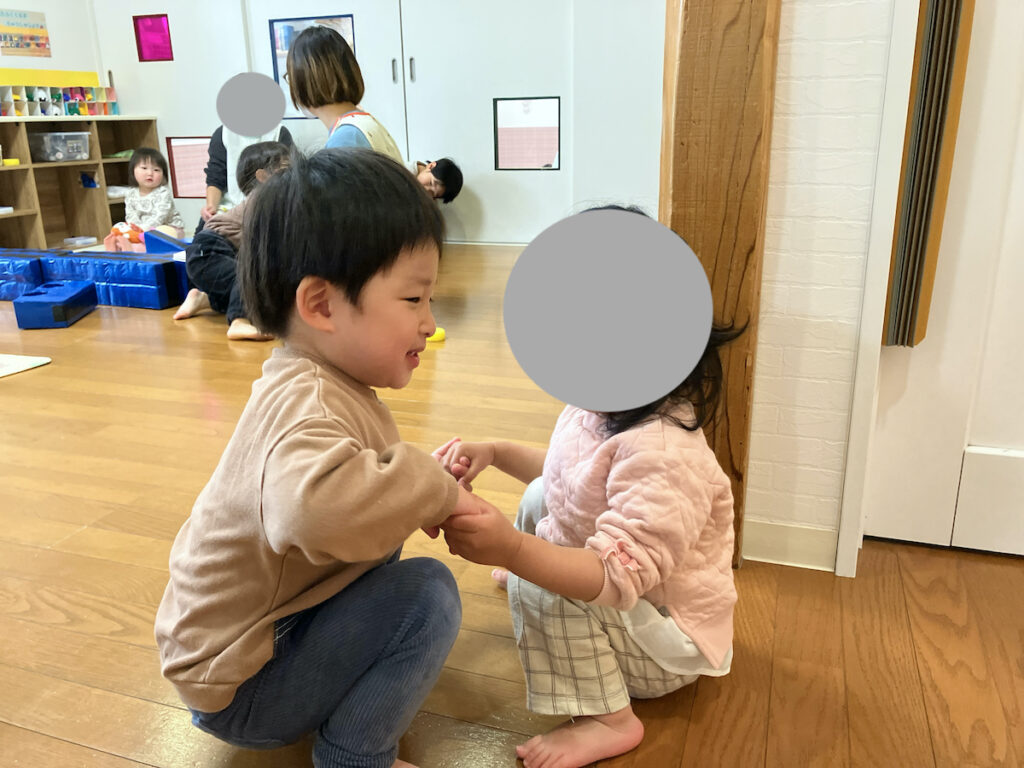 新しく入園したお友達の手を引いて「遊ぼう!」とエスコートしてくれたくま組さん。とっても優しいですね。素敵なお兄さんになってきていて、今後の成長が今から楽しみですね。