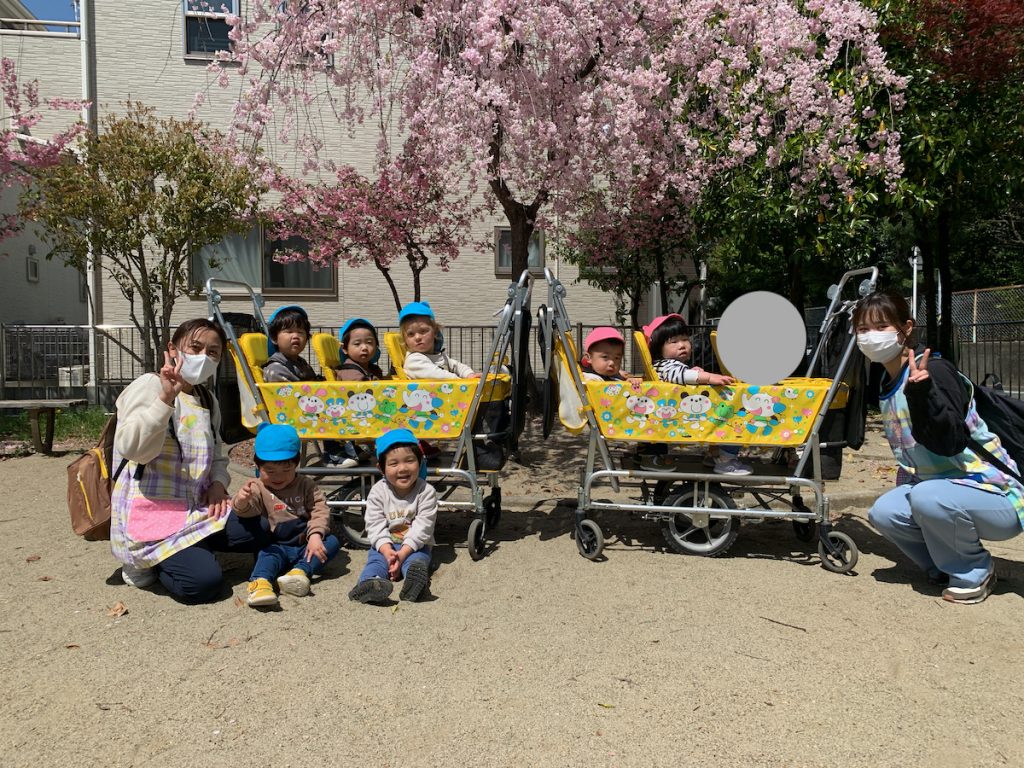 公園にお散歩に行った時に満開の桜が見られました。砂場にも桜が落ちていたので、おままごと遊びもしましたよ。楽しかったね!