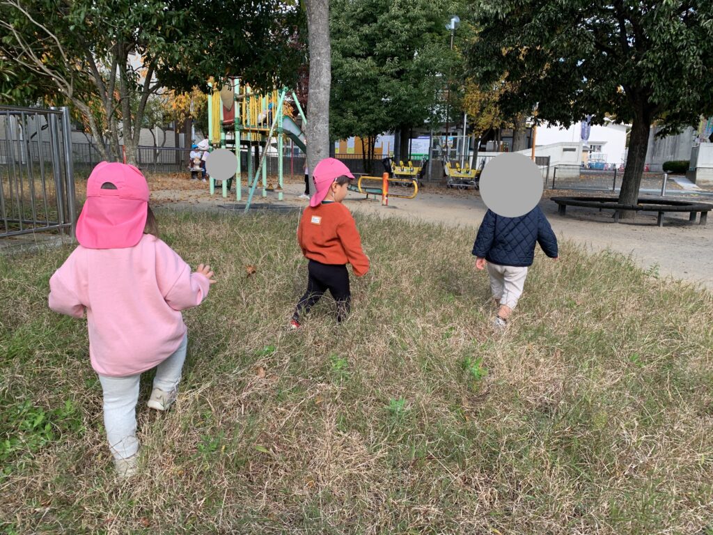公園に遊びに行った時の様子です。どんぐり拾いをしたり、草むらを歩いて感触を楽しみながら、探検ごっこをしたりと自然に触れながら遊ぶ子ども達でした!
