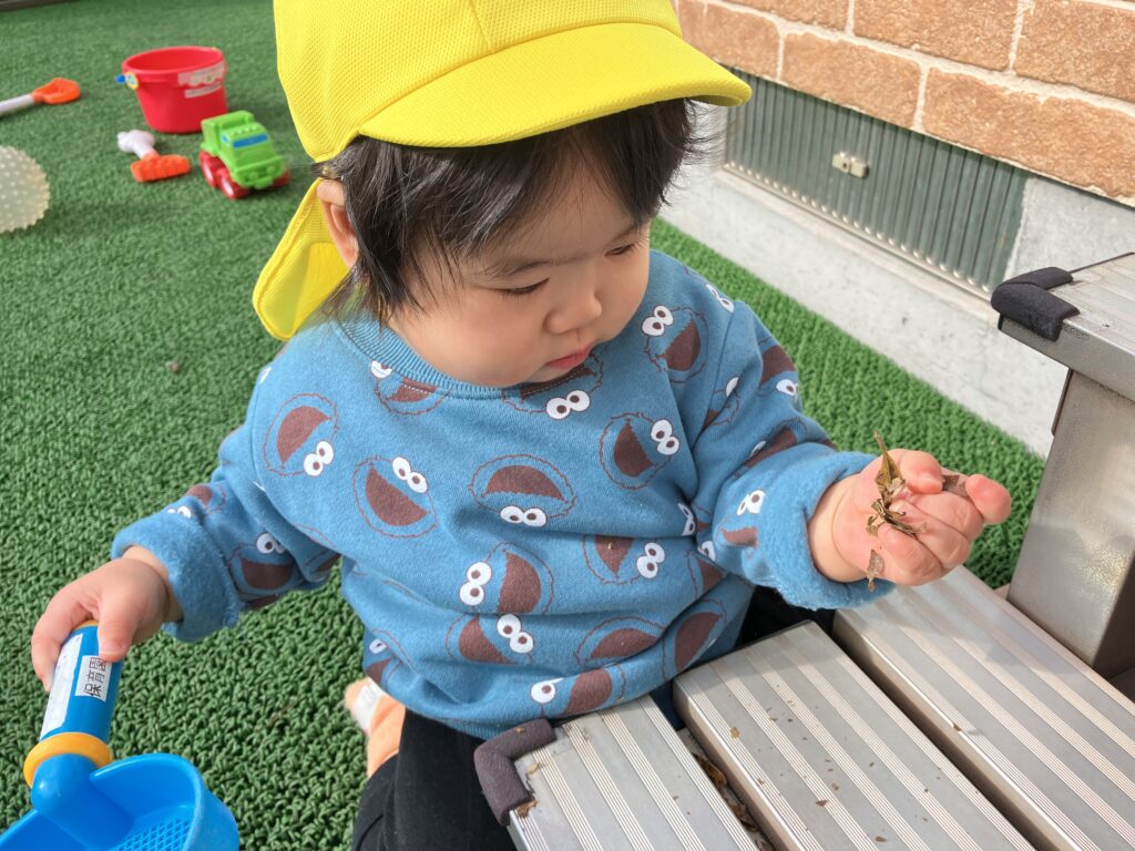 園庭で遊んだ時の様子です。園庭に落ちていた落ち葉に触れ、手で感触や音を楽しんだり、元気いっぱいかけっこをして、外遊びを楽しみました!