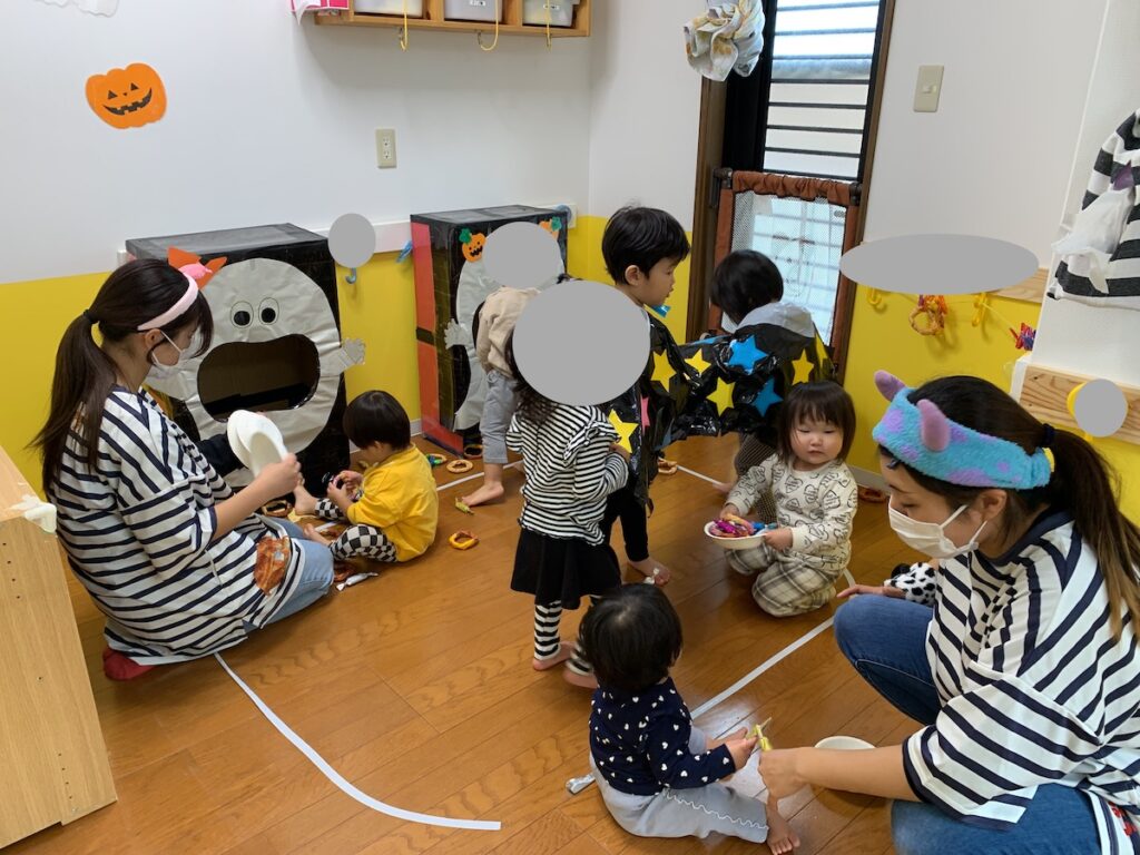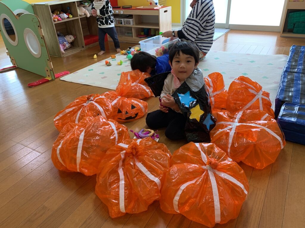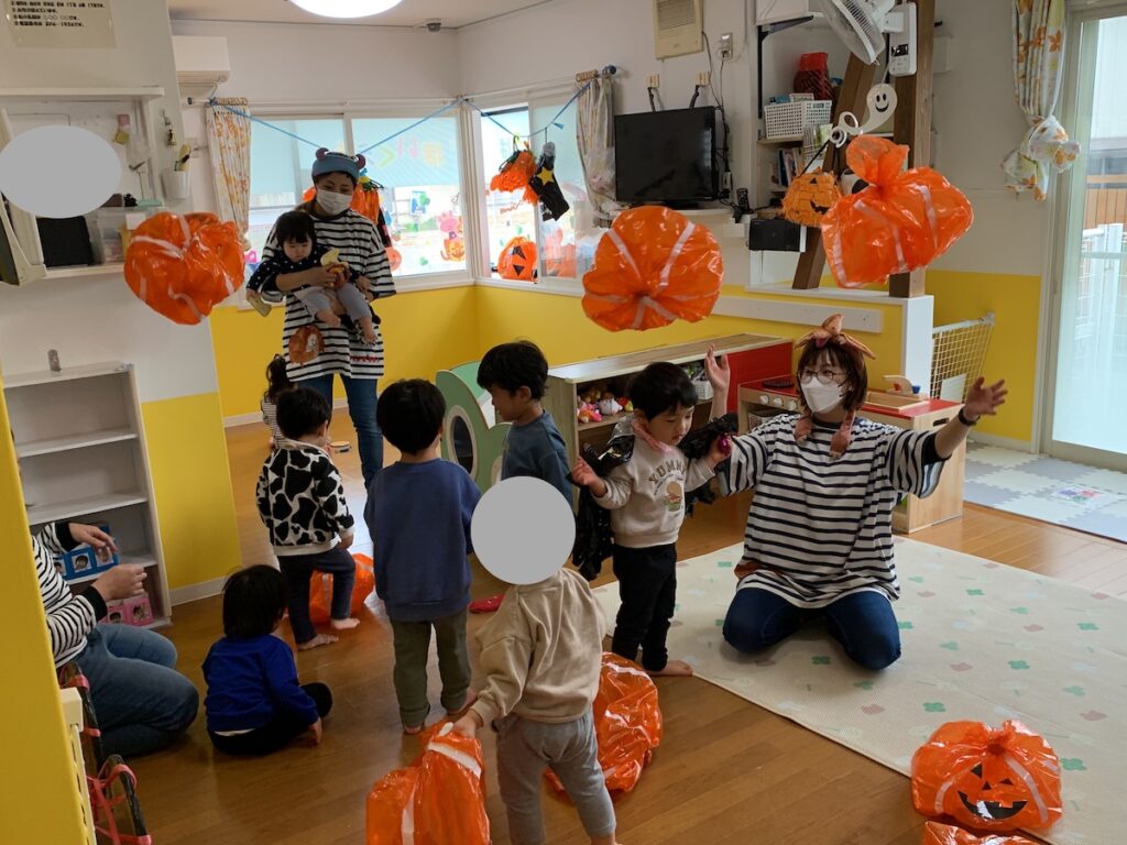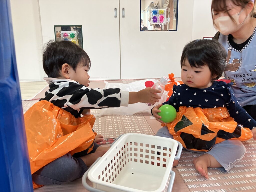かぼちゃボールコーナーでは高く飛ばしたり、かぼちゃさんにお菓子を食べさせてあげたり、好きな遊びを楽しんでいました。