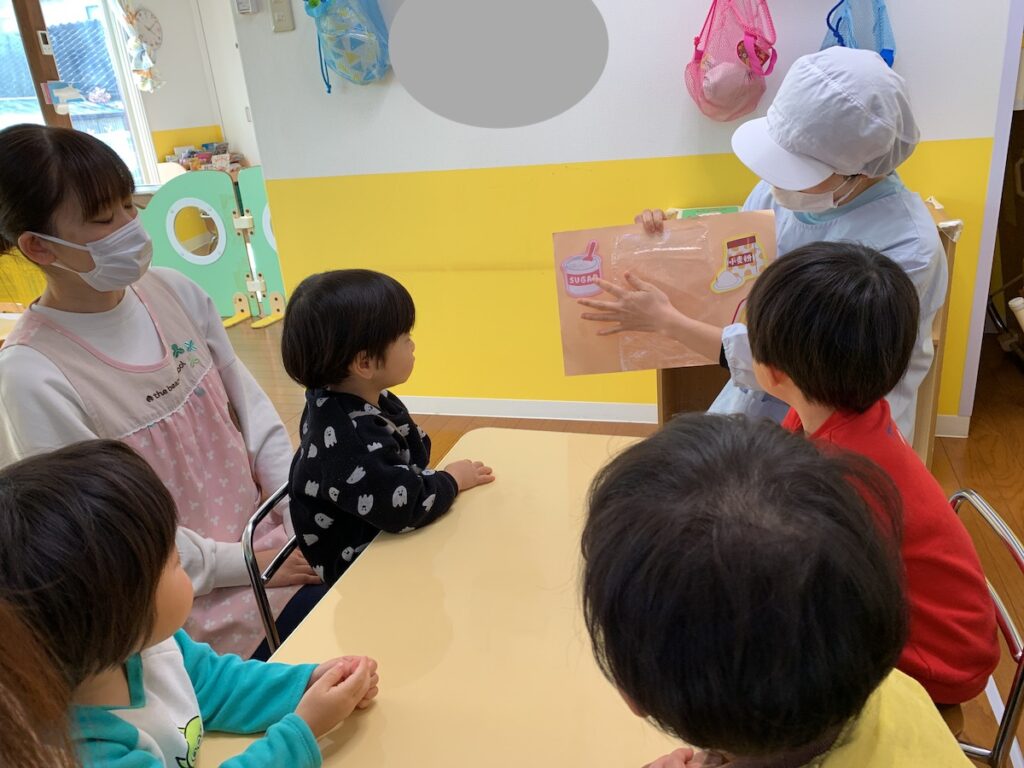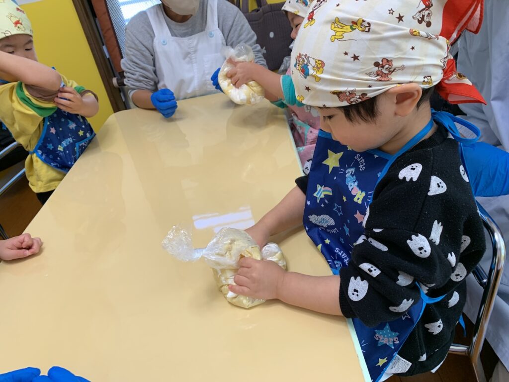 食育でクッキー作りをしました。栄養士の先生から材料や作り方のお話しを聞き「これ何かな?」と興味津々のくま組さん。ビニール袋に材料を入れてこねこね。出来上がった生地を手で伸ばしてクッキーの完成‼︎出来上がったクッキーは、午後おやつにみんなで食べました!
