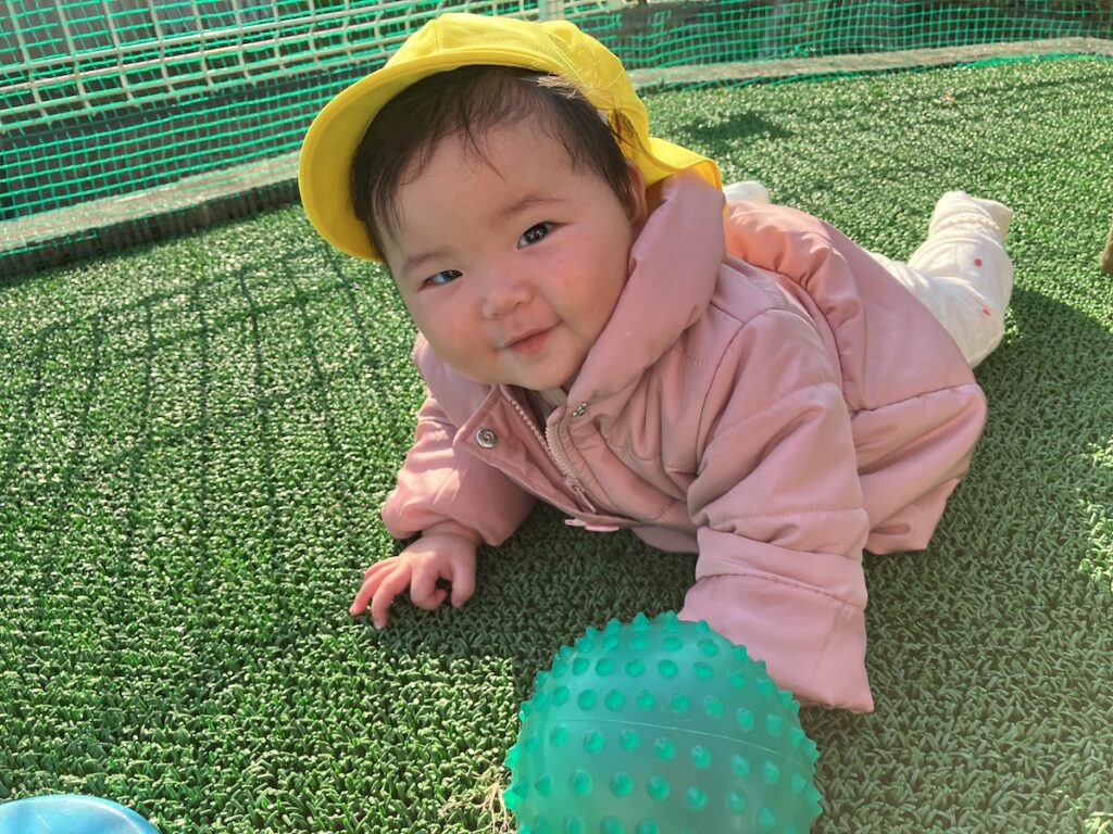 お天気の良い日は、ねこ組さんも園庭遊びを楽しみました!初めての人工芝の感触も嫌がらずに楽しんでいました♪