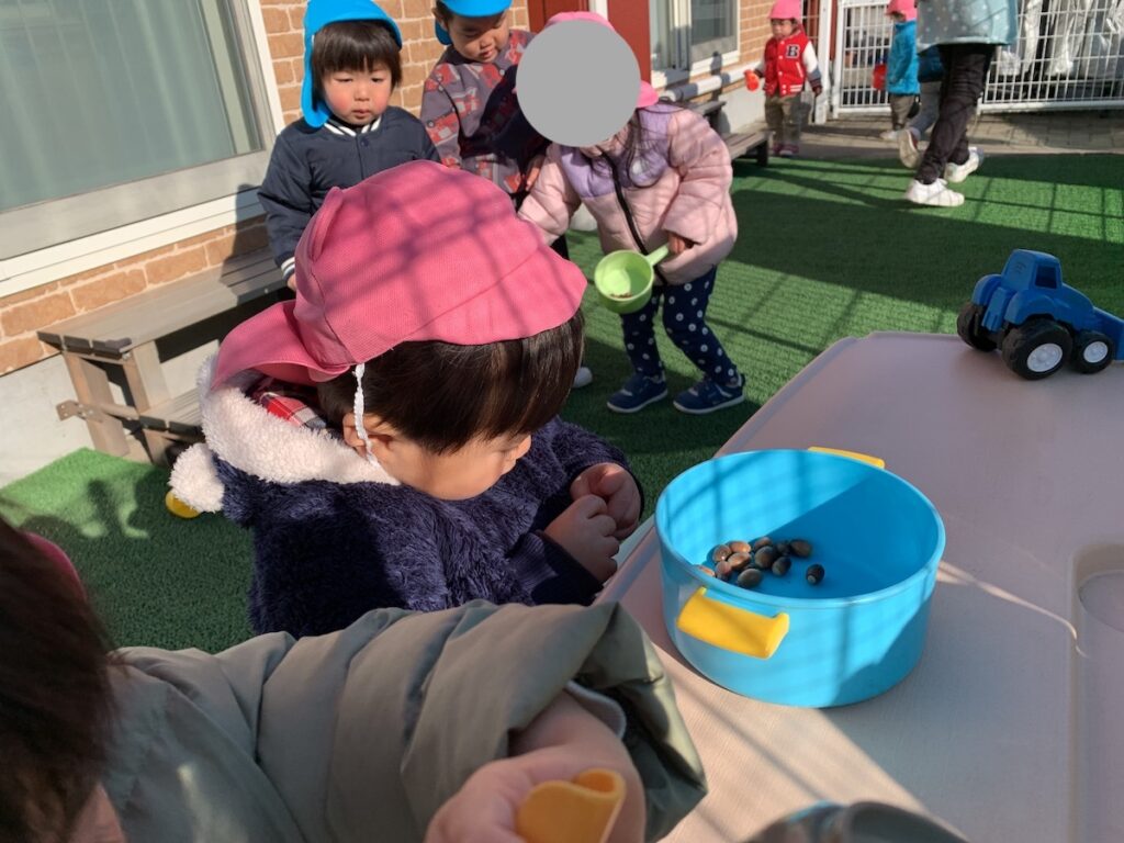 園庭では、公園で拾ってきたどんぐりでおままごとを楽しみました。フライパンやお鍋に入れて美味しそうな、お料理を作っていましたよ♪